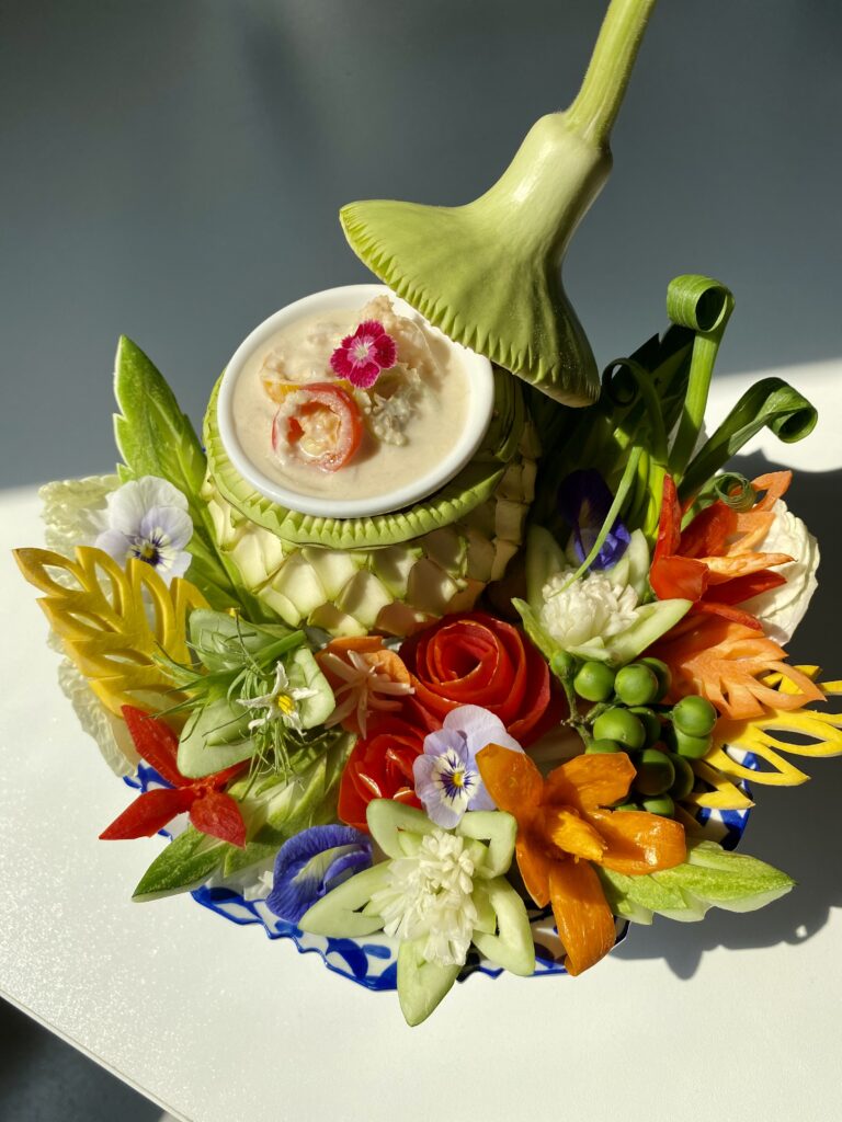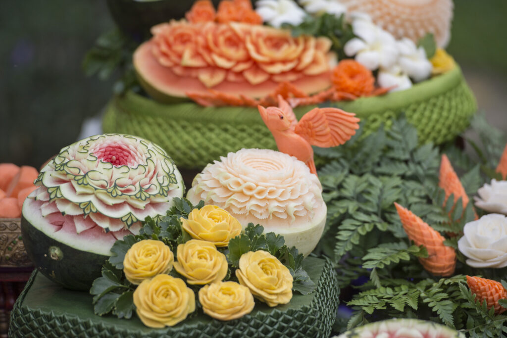 宮廷料理には、野菜や果物を花や葉の形に美しく彫刻する「カービング」という伝統があります。細やかな技術で作られた飾りは、料理を一層華やかに彩ります。